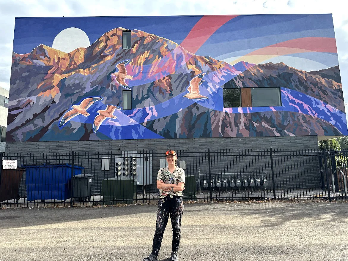 based in Salt Lake City, UT. Her work ranges from large-scale acrylic and gouache paintings on canvas, to building-sized murals for public projects, commercial businesses, and private residences.